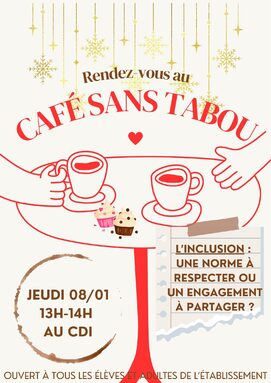 Par PAULINE NIARFEIX, publié le jeudi 8 janvier 2026 09:28 - Mis à jour le jeudi 8 janvier 2026 09:28Aujourd'hui à 13h au CDI a lieu le premier café sans tabou 2026 sur le sujet de l'inclusion. Nous vous attendons nombreux pour discuter autour de ce thème ô combien important :) -